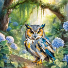 A vibrant, stylized owl perched on a branch, featuring bold splashes of blue and yellow against a dark background. The owl’s striking eyes and detailed feathers create an eye-catching focal point.