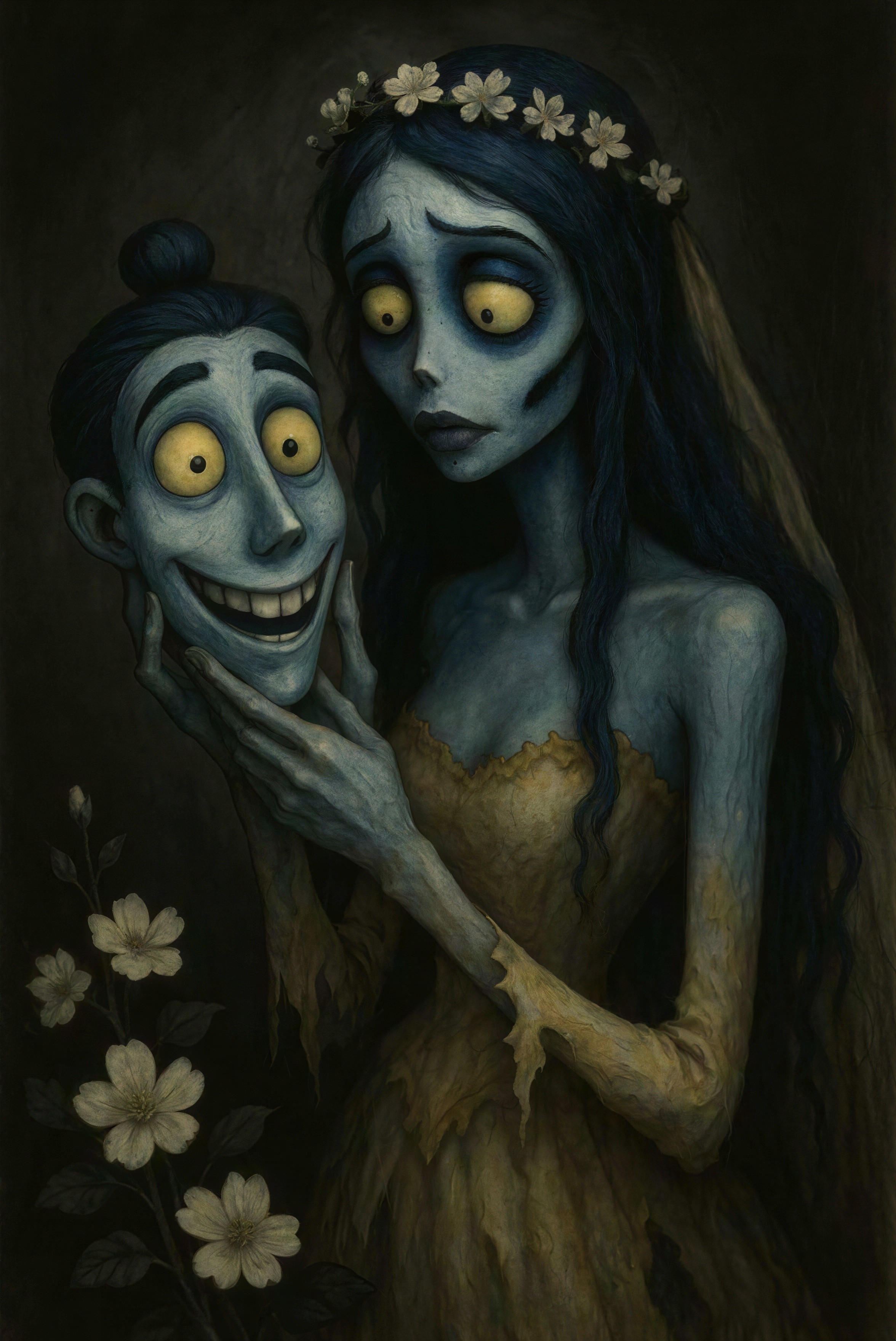 A detailed illustration in the style of Corpse Bride shows a pale blue-skinned female figure, with long dark blue hair, a white flower crown, a torn pale yellow wedding dress, and big yellow eyes with black pupils, holding a mask of a pale blue-skinned male figure with a big smile