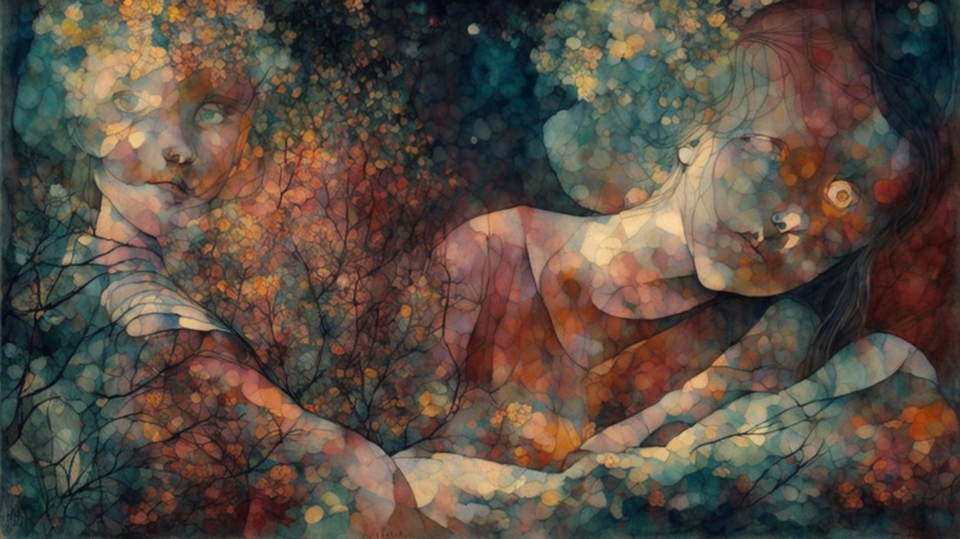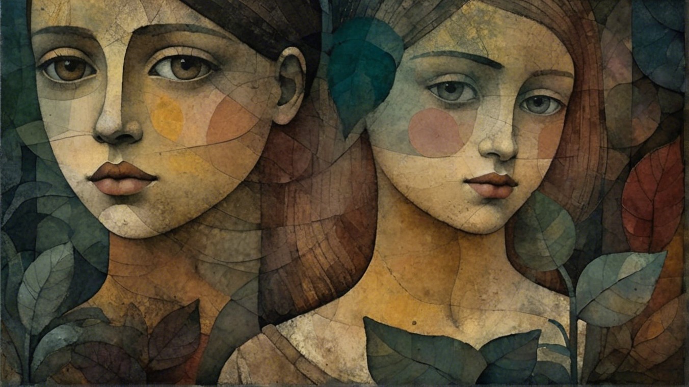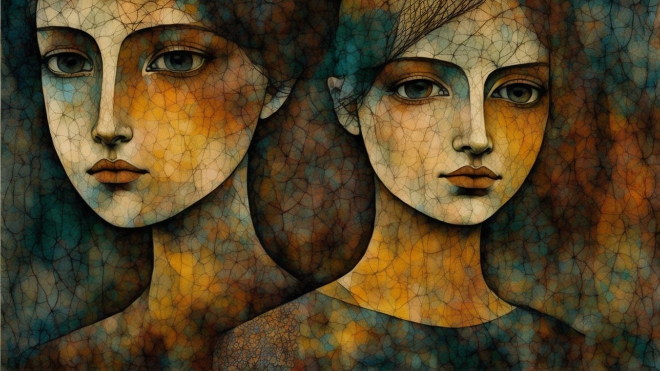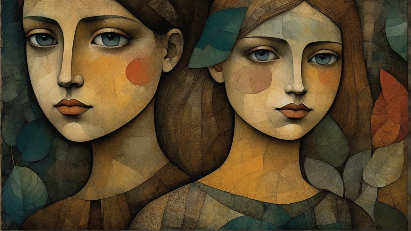 The artwork features two stylized female figures side by side, characterized by bold, geometric shapes and muted colors, evoking a sense of connection and introspection.