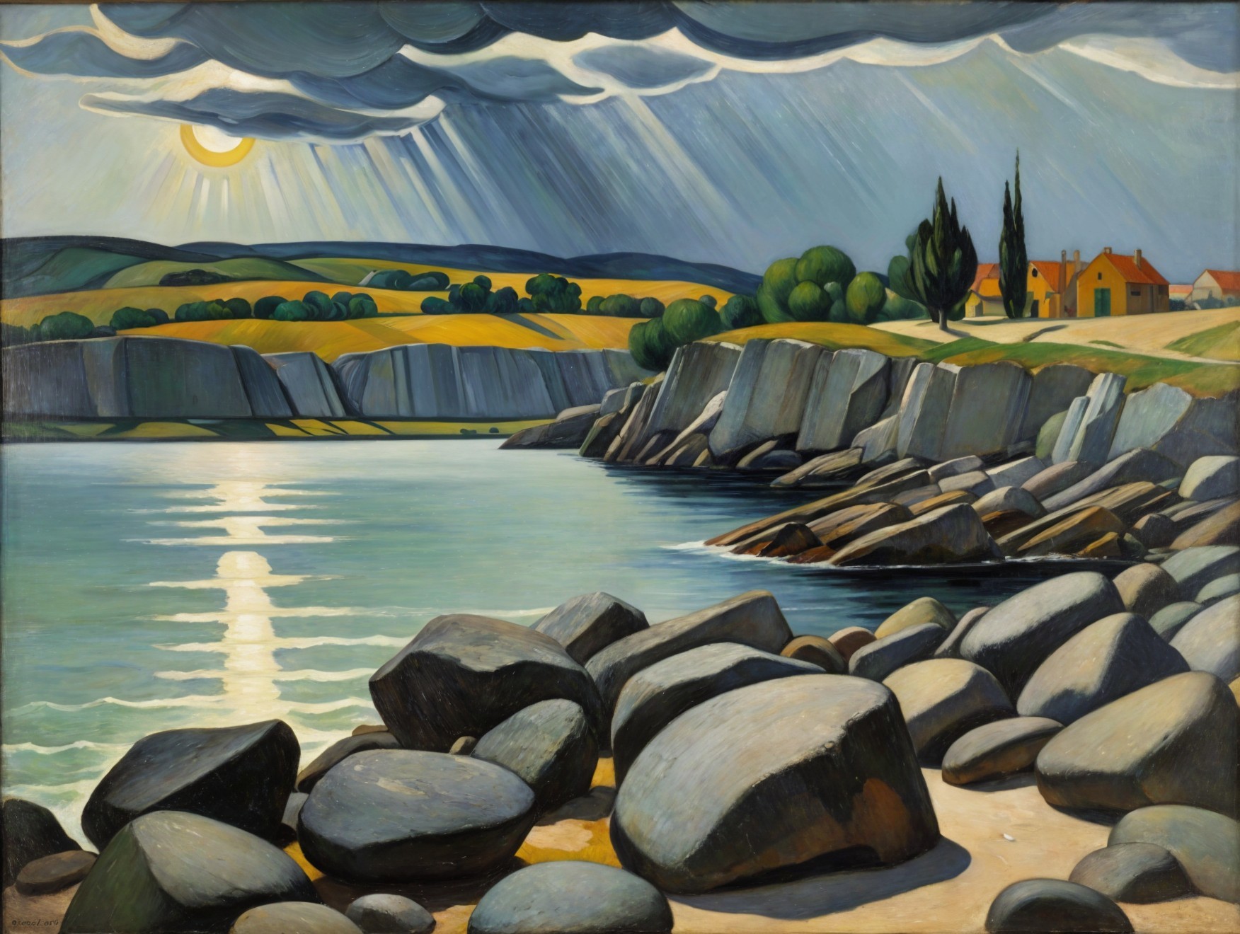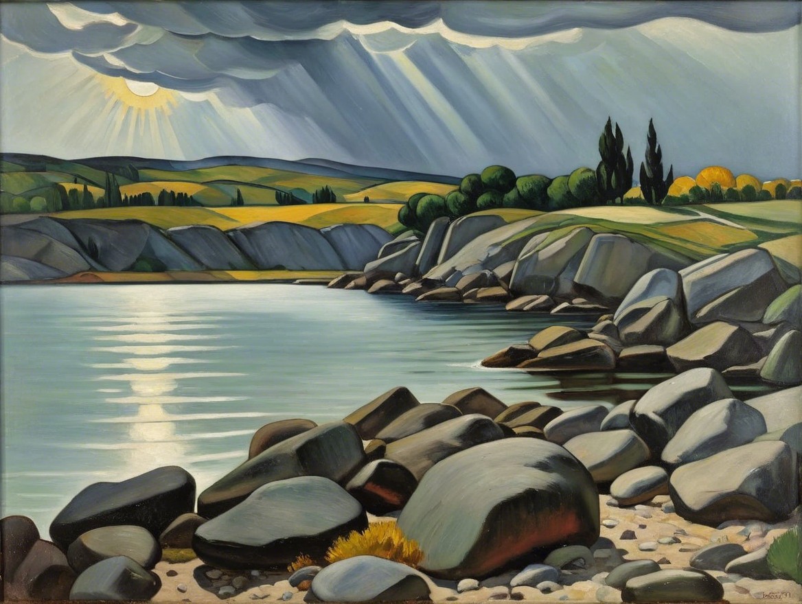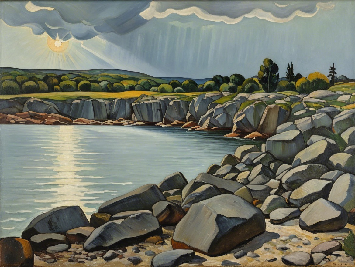 Serene Coastal Landscape with Rocky Shoreline and Sunlight