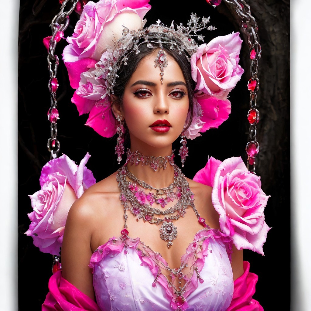 A woman adorned with roses and jewelry gazes forward against a dark backdrop.