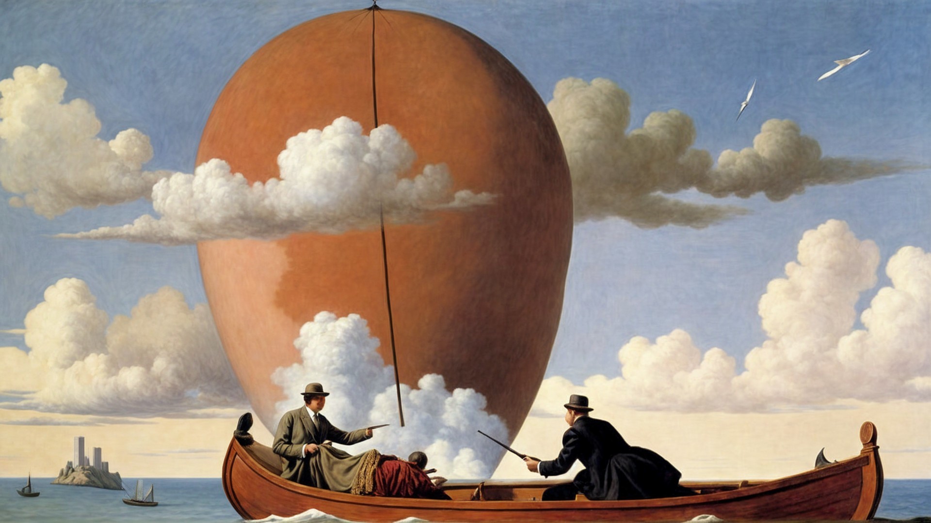 A whimsical scene features three figures in a boat, guiding a giant pink balloon atop fluffy clouds. A serene landscape with towers and soft clouds adds to the surreal atmosphere.