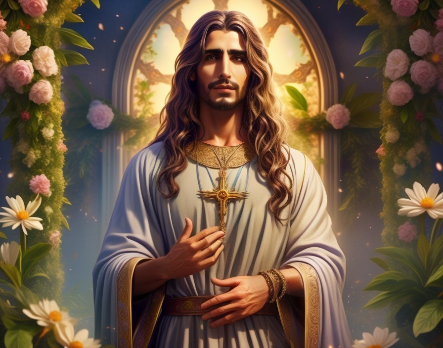 A stylized illustration of priest with a crucifix, surrounded by flowers and arches bathed in warm light.