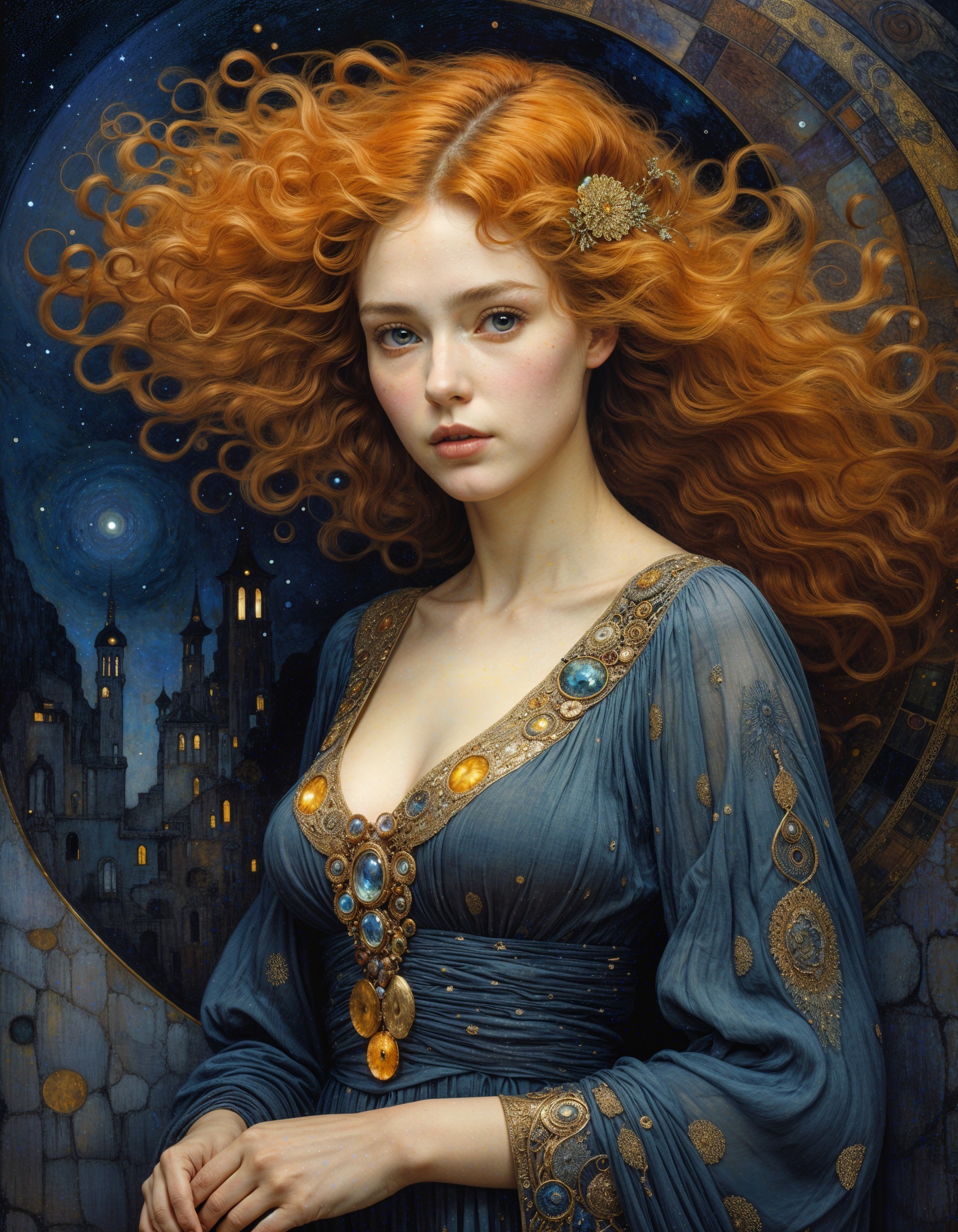 A striking portrait of a woman with flowing red hair adorned with a flower. She wears an elegant blue gown with intricate gold detailing, set against a dark, atmospheric background.