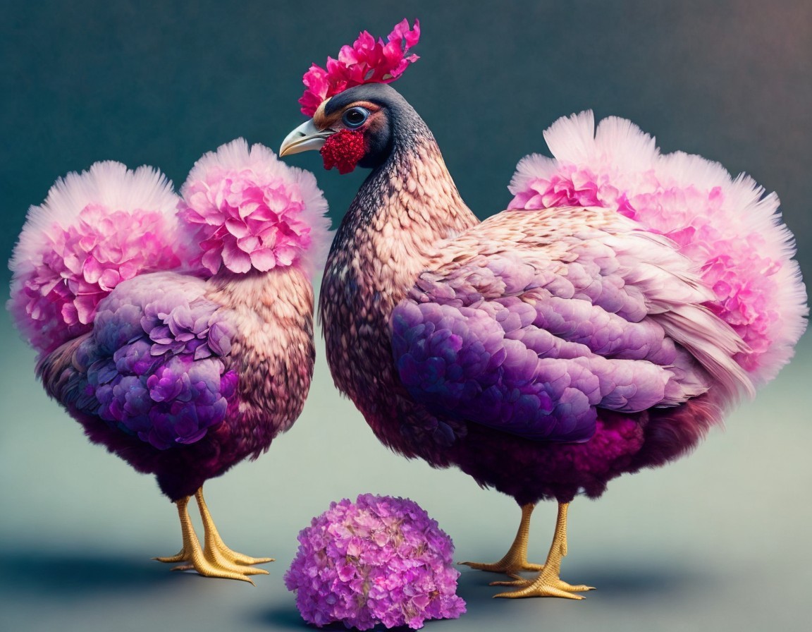 Two colorful birds adorned with vibrant pink and purple flower petals, featuring floral crowns and fluffy plumage, create a whimsical and artistic scene against a soft gradient background.