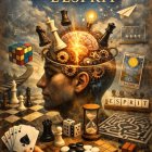 A surreal and psychedelic depiction of a mind-bending puzzle, with two heads facing each other, one blue and mechanical with an exposed brain, the other human with "MIND GAMES" in place of a brain. The blue mechanical head on the left has a visible brain, while the human-like