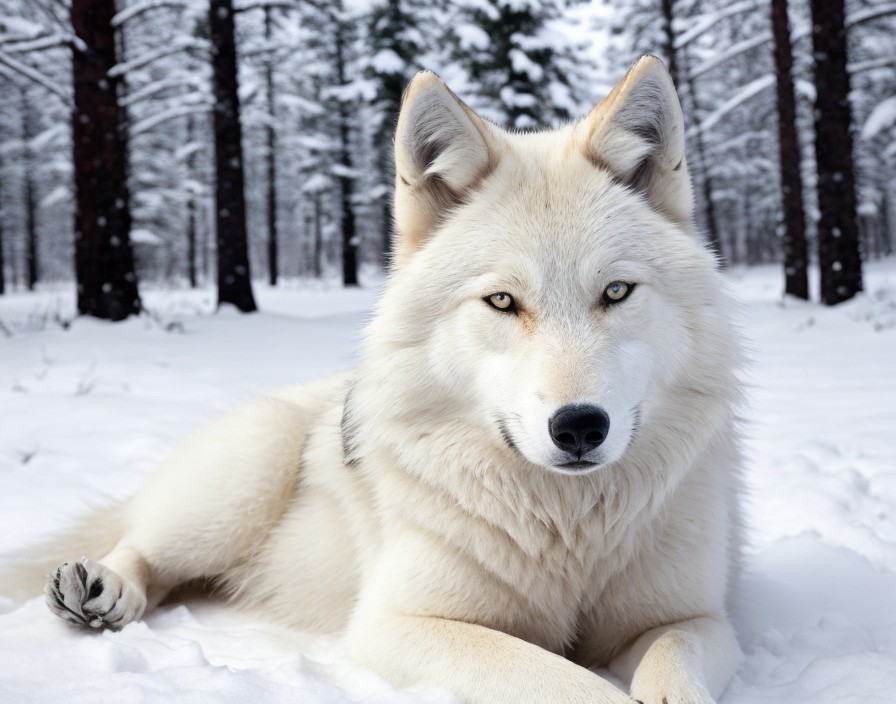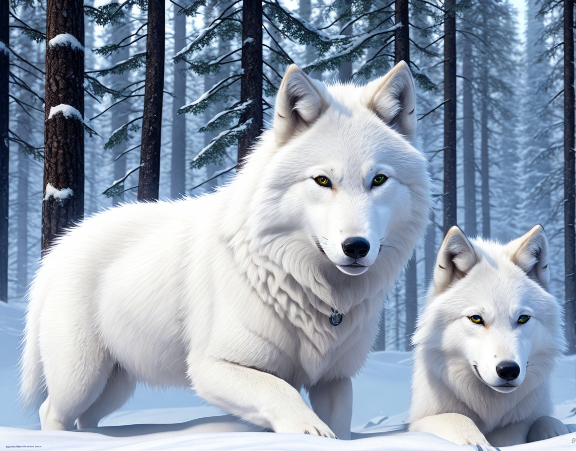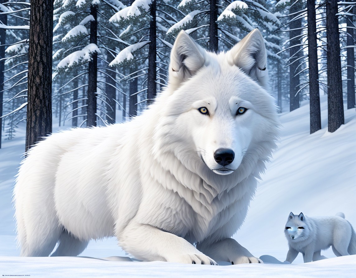 A detailed illustration of a white wolf with piercing blue eyes amidst a snowy forest landscape.