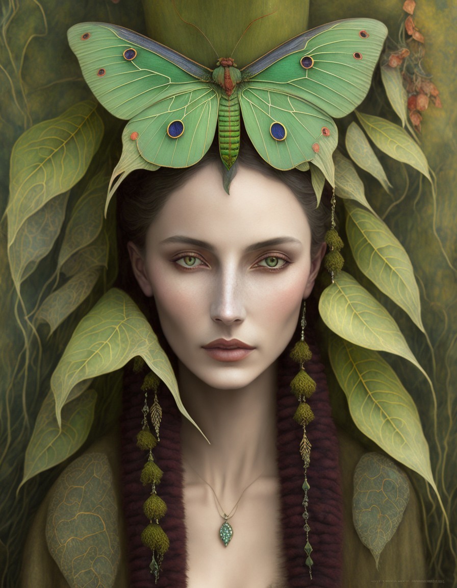 Beautiful woman with a Luna moth hat, portrait in sienna, patina of ancient stone with moss, art brut, moody, somber, desaturated colors, in the style of Paul Klee, Arthur Rackham