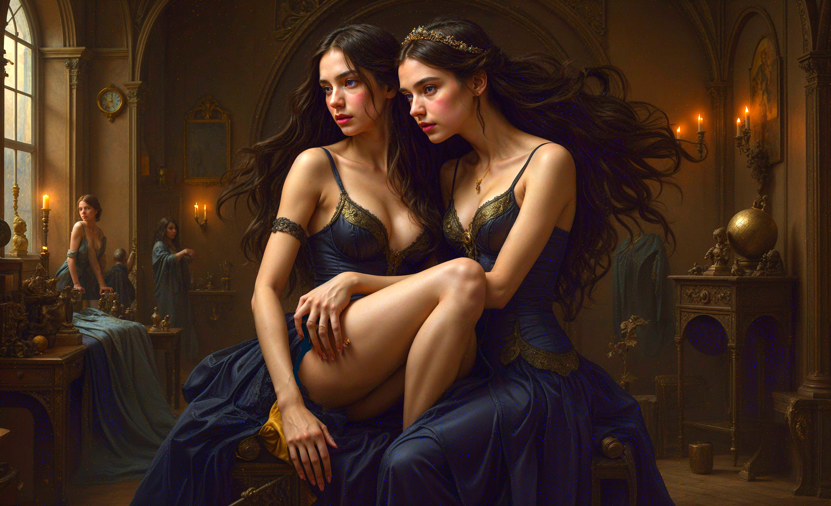 The image features two elegant women in dark blue dresses, seated closely in a vintage room adorned with candles and ornate decor, conveying a mystical and intimate atmosphere.