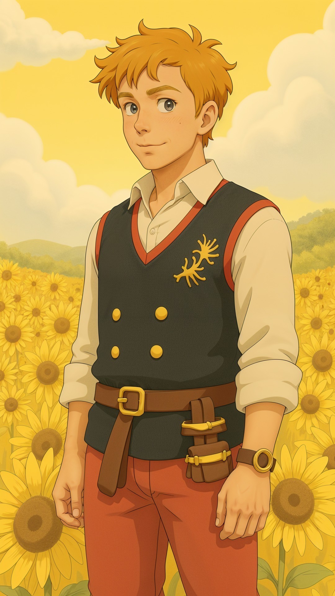A muscular young man with blond hair stands confidently in a vibrant yellow flower field, wearing a sleeveless black shirt and orange pants, with a scenic sunset glow in the background.