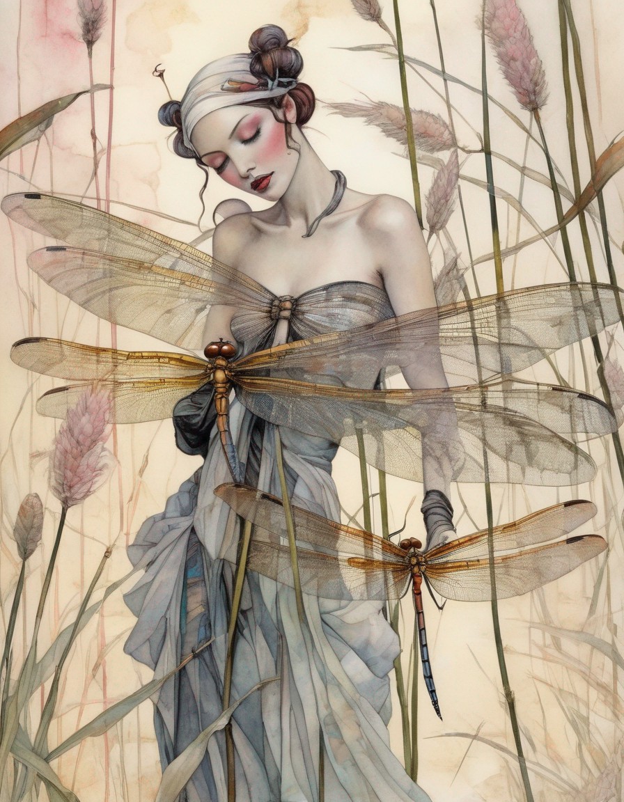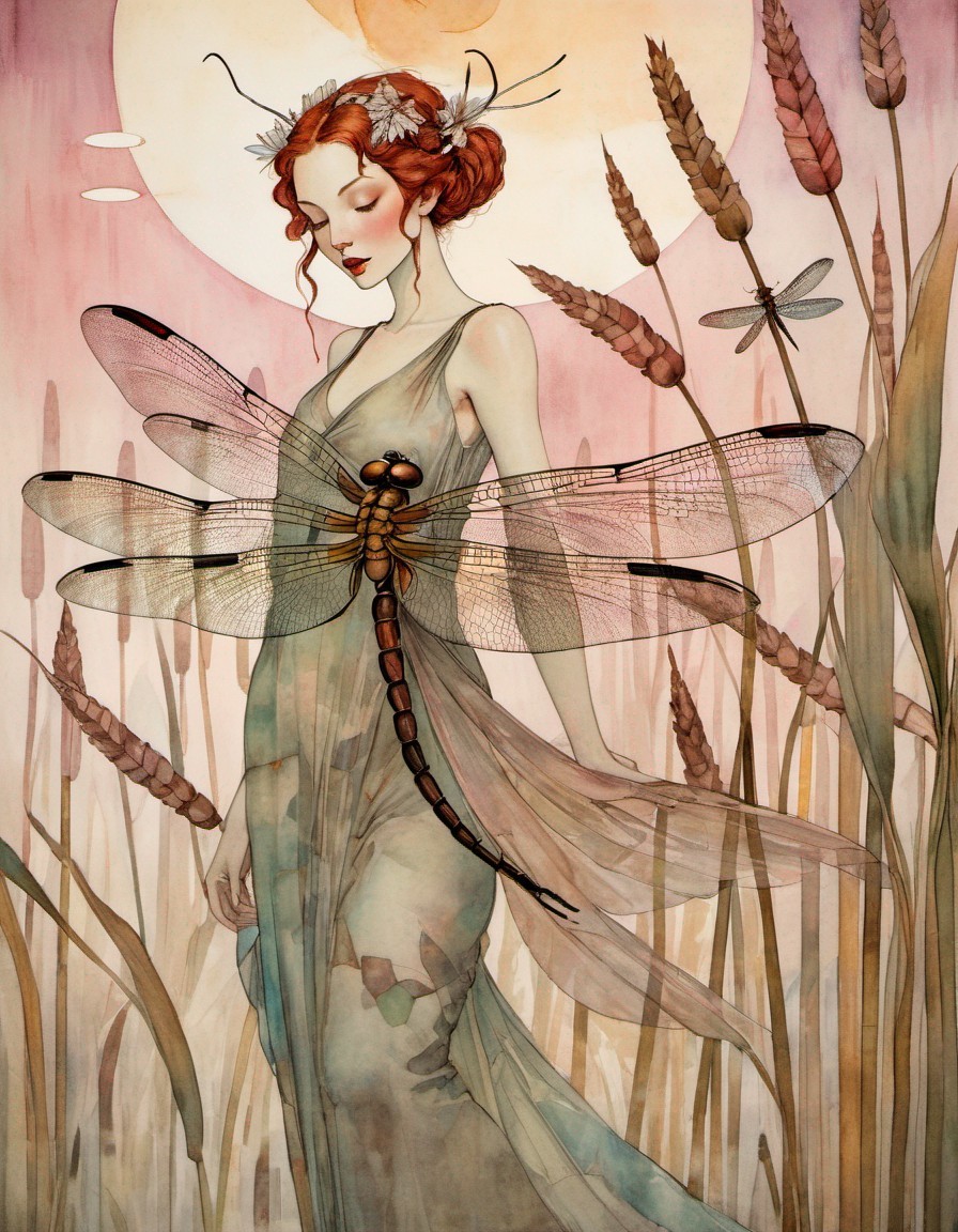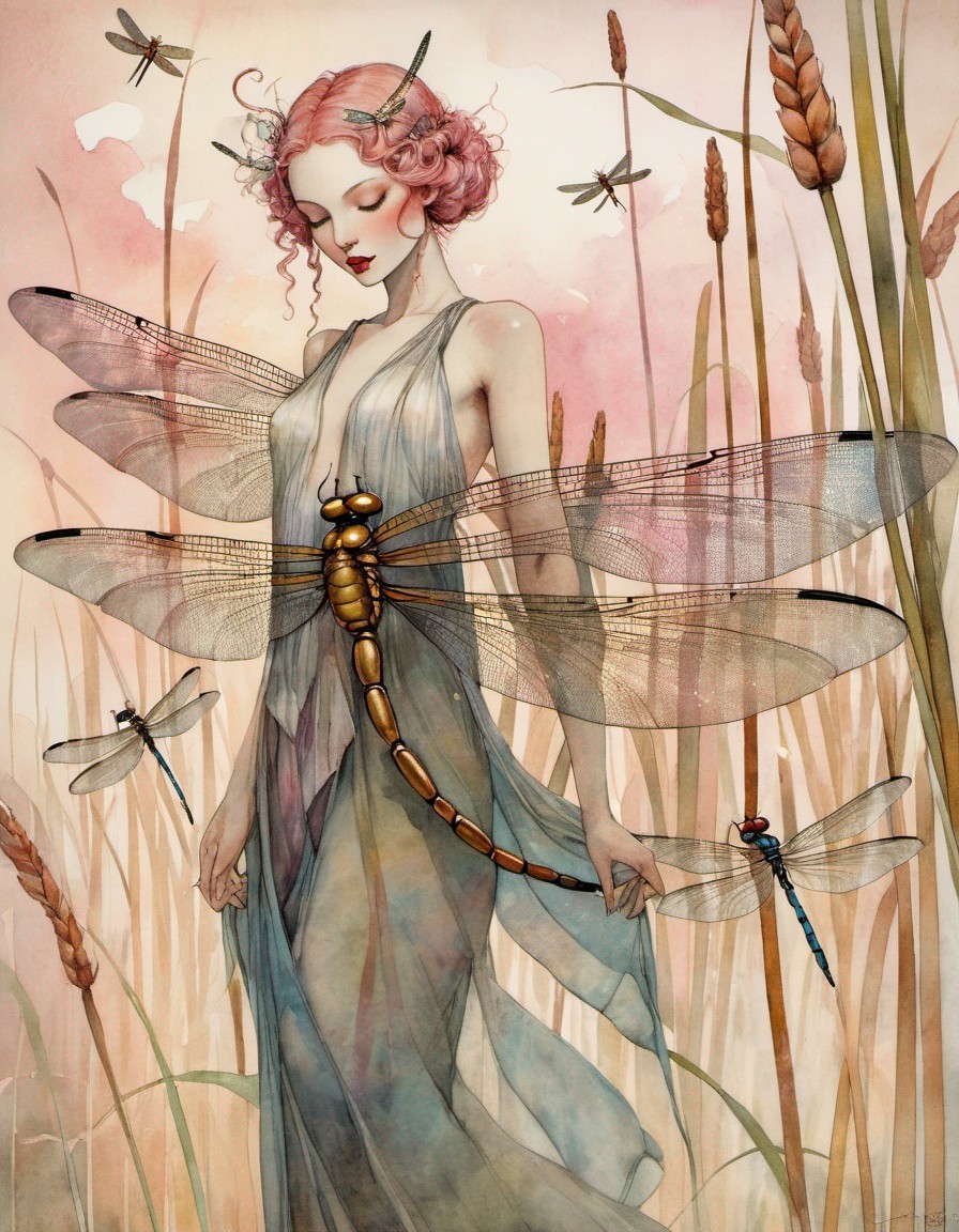 Prompt: A full colored painting of a beautiful nymph dragonfly woman with her swarm of dragonflies circling the cattails, whimsical, beautiful, poignant, colors rose, gold, white pink, black.