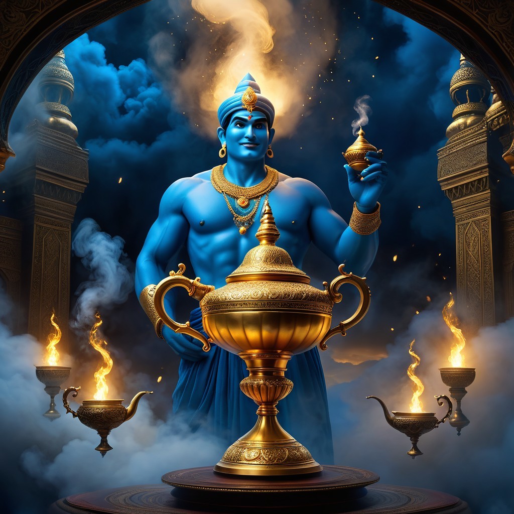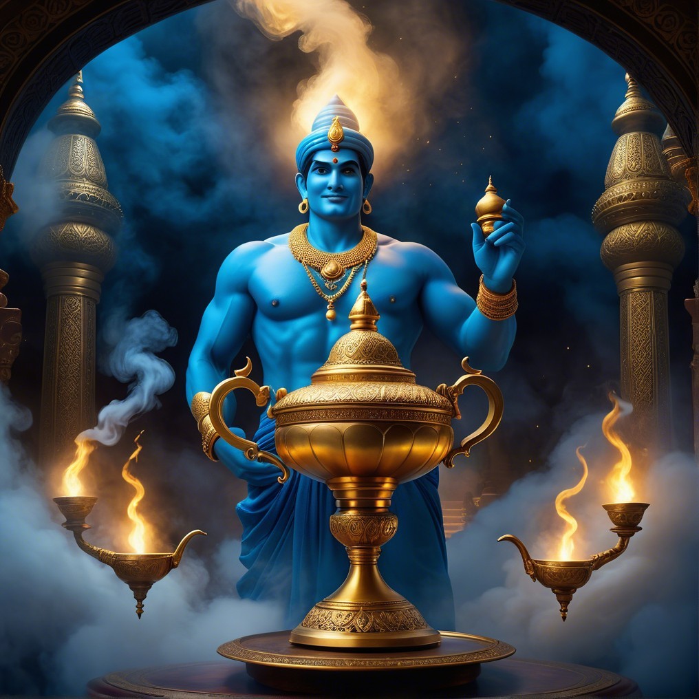A majestic blue-skinned djinn holds a golden lamp, surrounded by swirling smoke and shimmering lights. The setting exudes an aura of mystique and divinity, reminiscent of ancient lore.