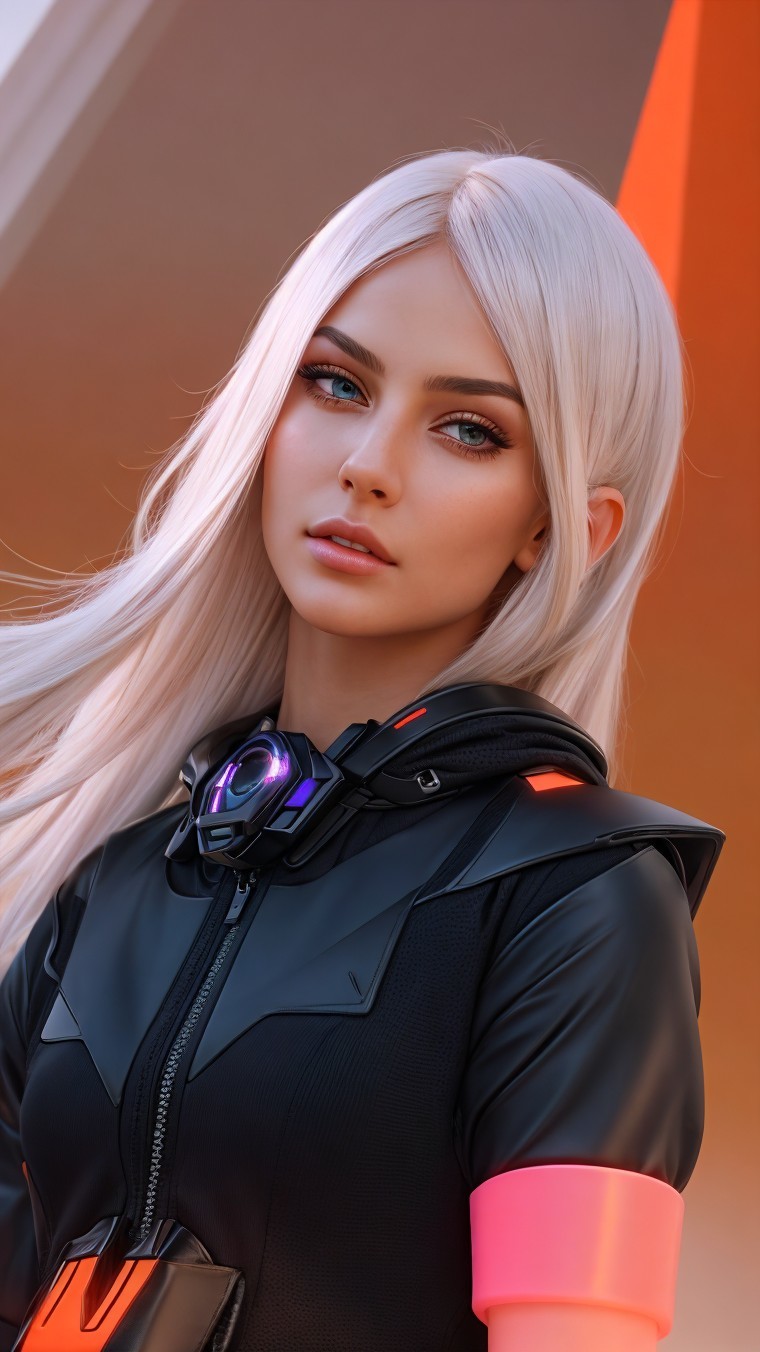 A striking portrait of a young woman with long, flowing silver hair, wearing a futuristic black outfit with vibrant pink accents. Her captivating blue eyes enhance the sci-fi aesthetic of the image.