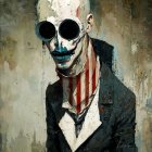 The artwork features a skeleton with a prominent skull, dressed in a dark, elegant suit. Its chest reveals red and white stripes, set against a moody, cloudy backdrop. The piece exudes a haunting yet artistic vibe.