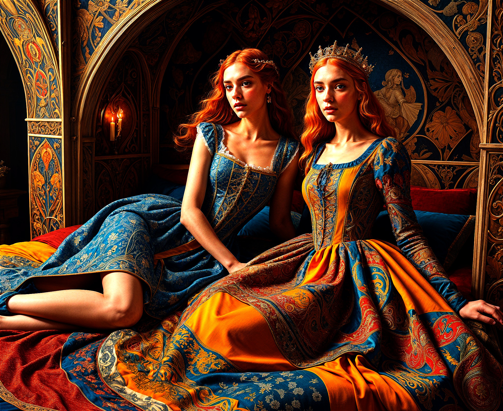 A surreal, Escher-style world featuring two medieval women in elegant dresses striking poses on a whimsical bed with intricate patterns. Enchanting, dreamlike colors and vibrant contrasts create a captivating and fantastical ambiance, blending medieval aesthetics with surreal elements. The digital painting, shot with a Nikon D850, boasts sharp focus and intricate details, enhanced by