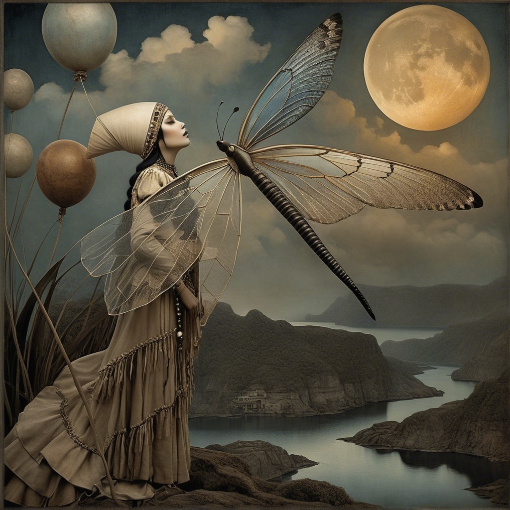 A striking portrait of a woman adorned in elaborate tribal attire with feathers and jewelry, set against a mystical landscape under a glowing full moon. The atmosphere is ethereal and captivating.