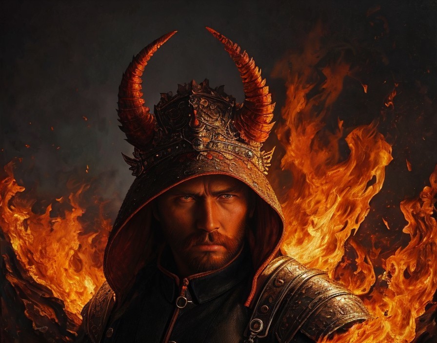 A menacing figure with horns and glowing eyes stands before flames, exuding a powerful and dark presence.