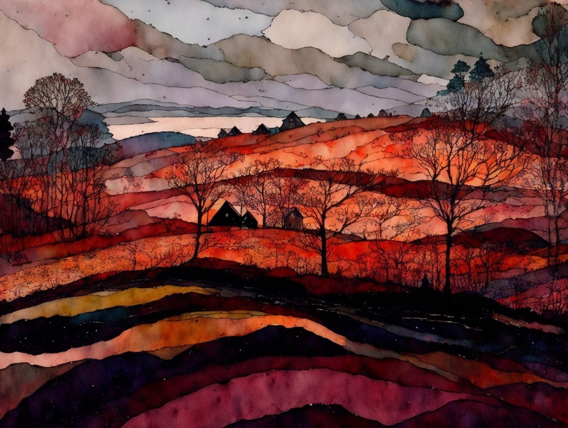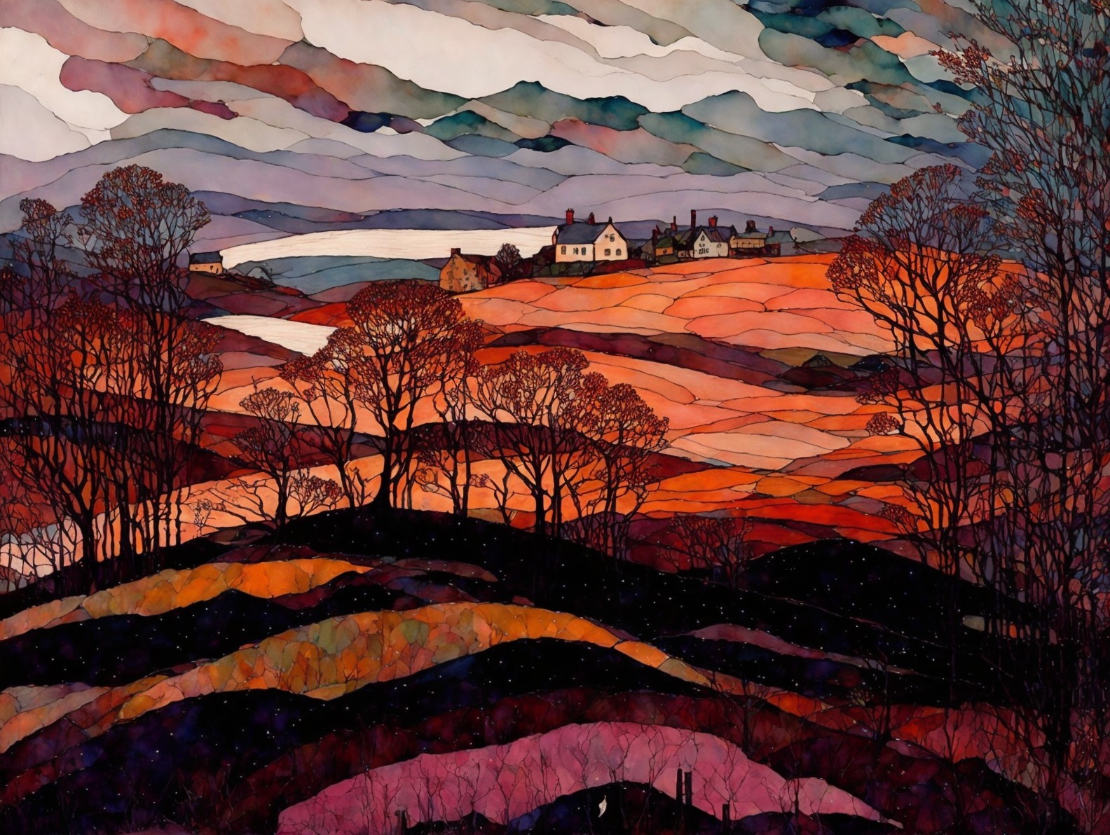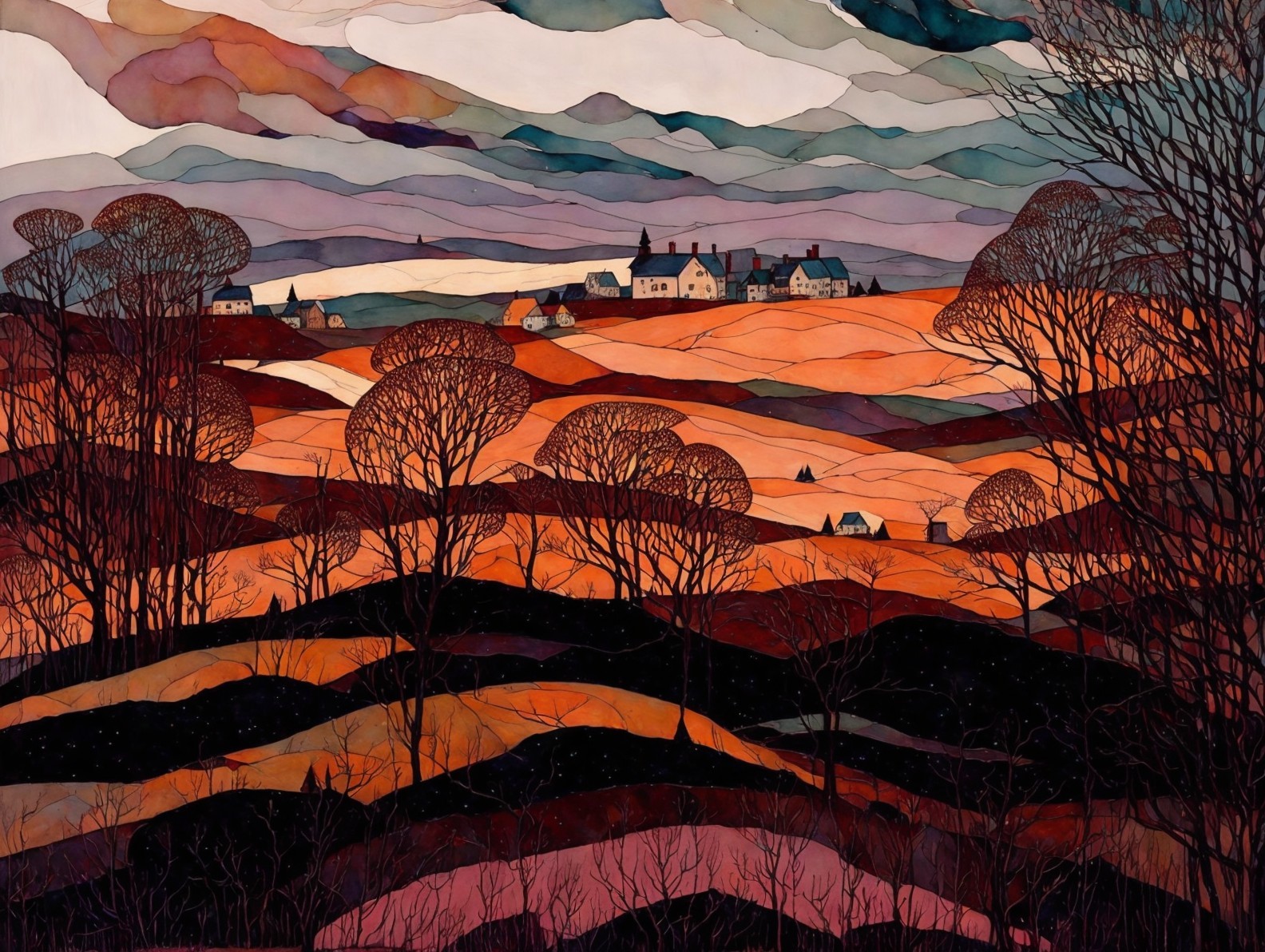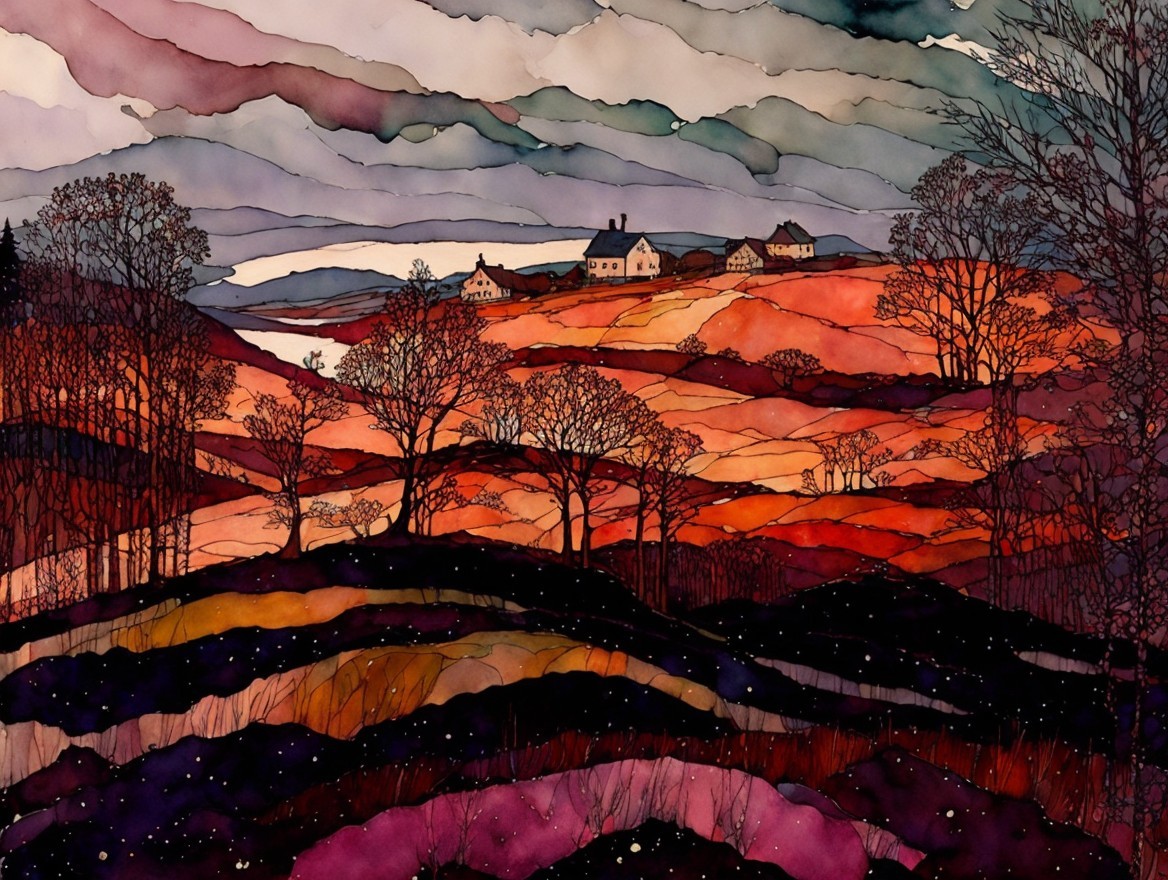Vibrant Landscape with Dramatic Sky and Village