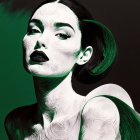 A striking portrait of a woman with sleek, dark hair styled elegantly. Her bold lips and intense gaze create a captivating contrast against the swirling green and black backdrop.