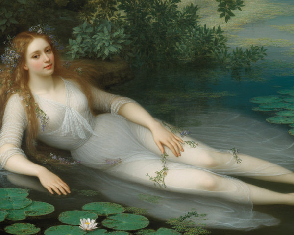 A stunning figure in a flowing blue dress, created from vibrant splashes of color. The dress appears to blend with the environment, set against a soft, dreamy sky and grassy landscape.