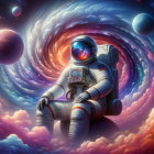 An astronaut in a white space suit sits among vibrant clouds, gazing into a cosmic scene filled with swirling galaxies and colorful planets, reflecting the wonders of the universe.