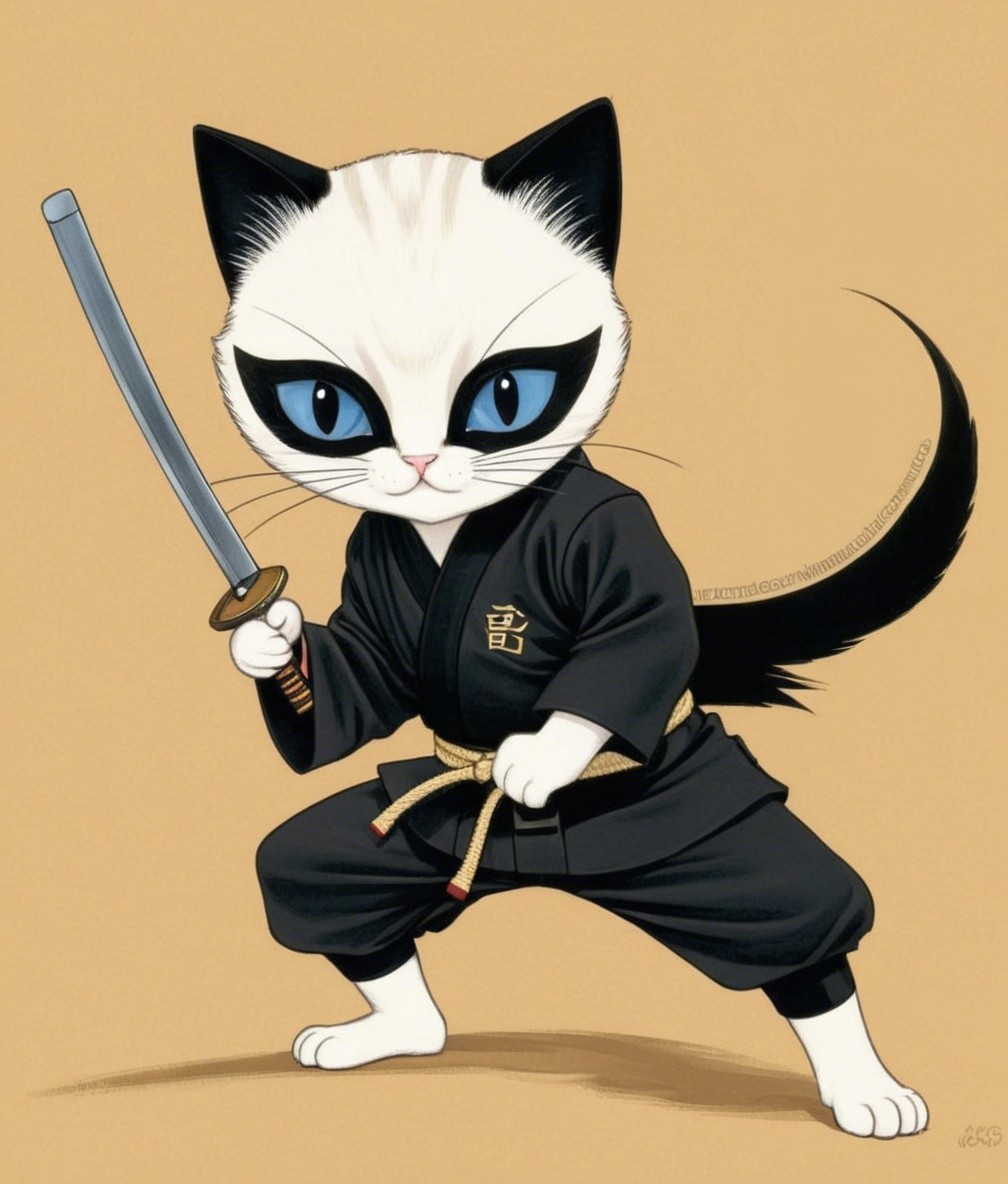 A playful cartoon cat in a black ninja outfit holds a katana, striking a dynamic pose. With large, expressive blue eyes and a stylish appearance, it exudes a fun, adventurous spirit.