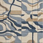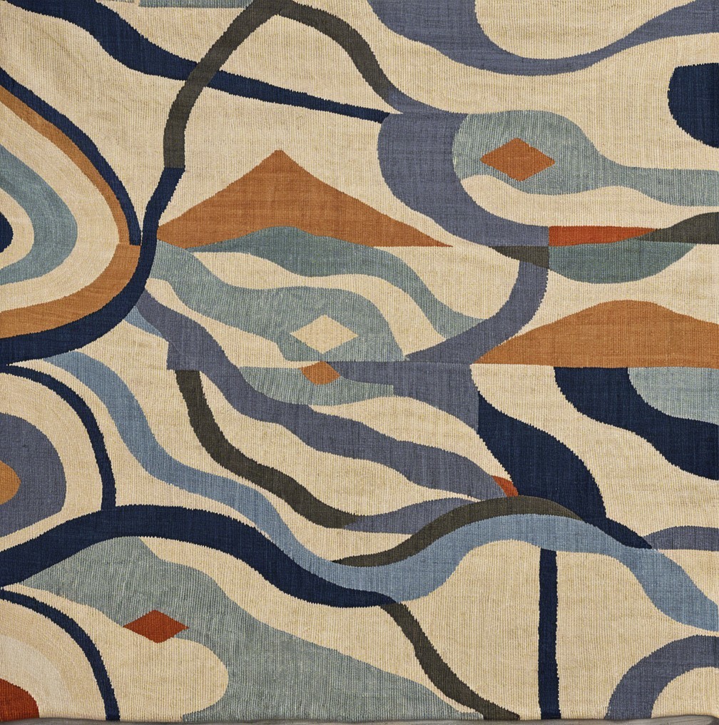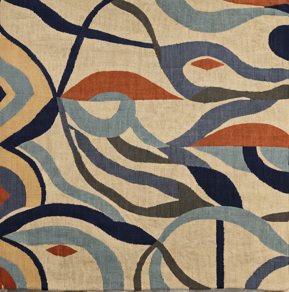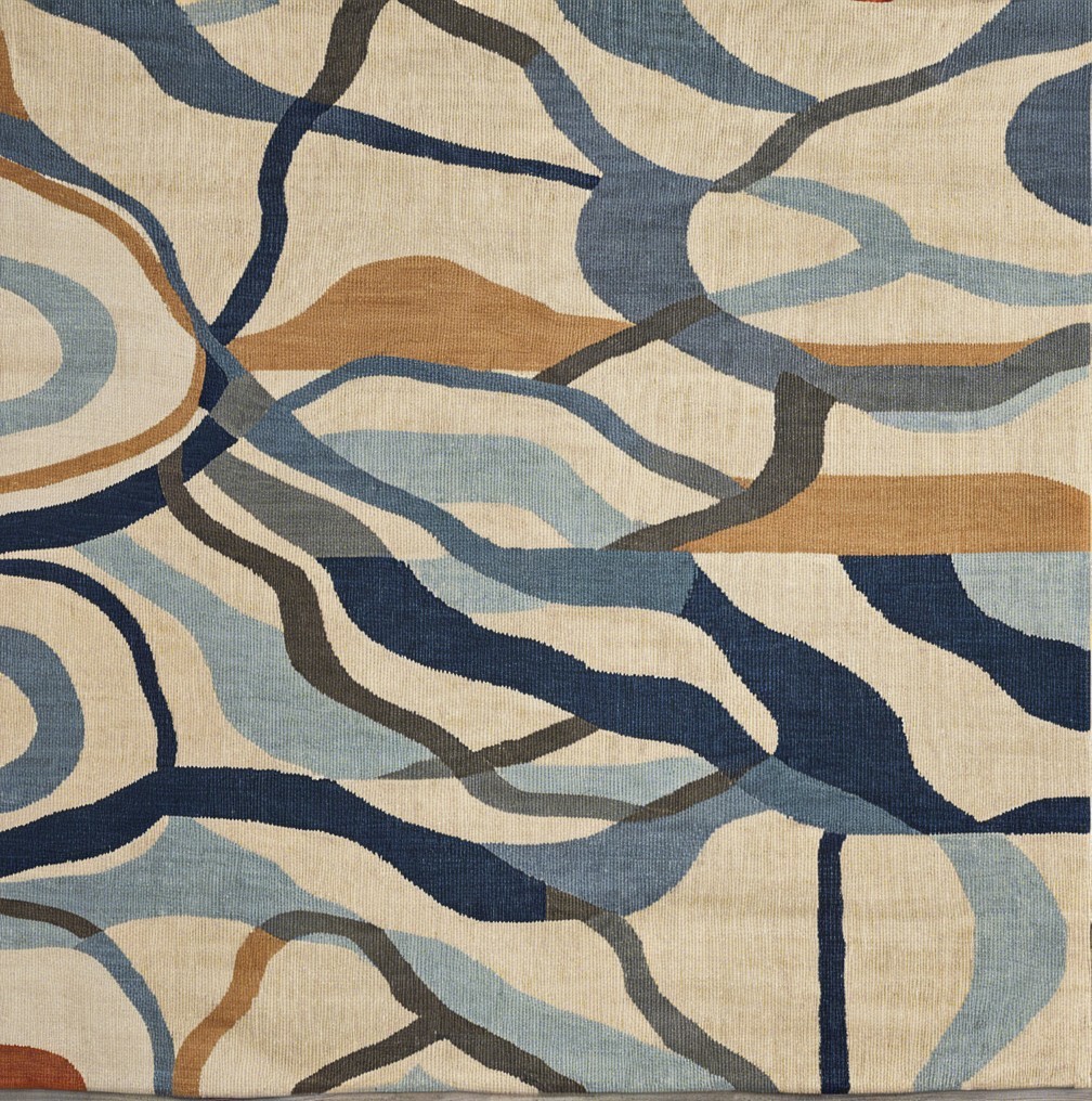 The image features an abstract pattern with flowing, interwoven lines in warm and cool tones, including reds, blues, and greens, set against a light beige background, creating a dynamic visual effect.