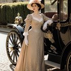 A woman in an elegant, gold embroidered gown stands by a vintage horse-drawn carriage, adorned with intricate details. She wears a large hat and gloves, exuding classic elegance.