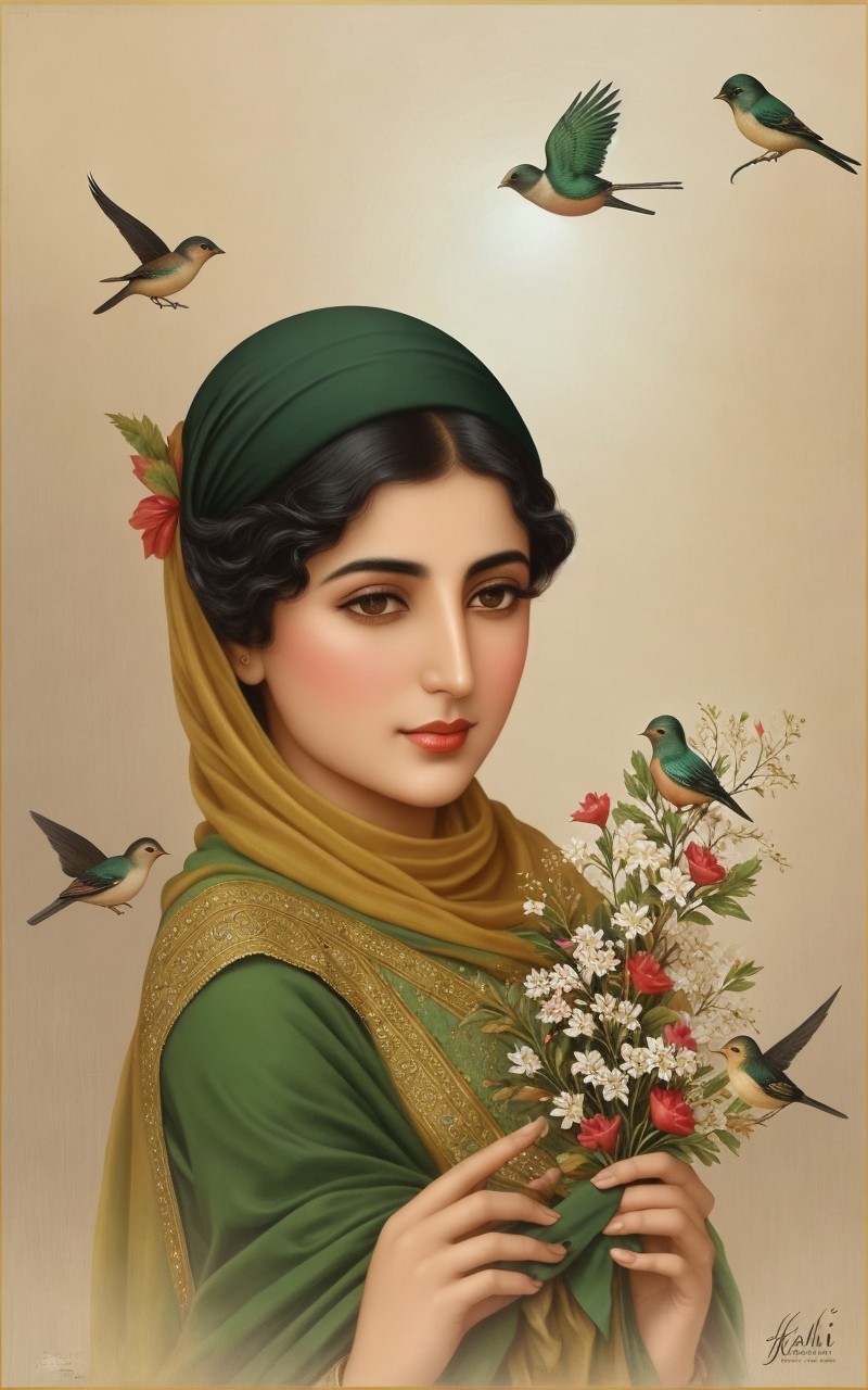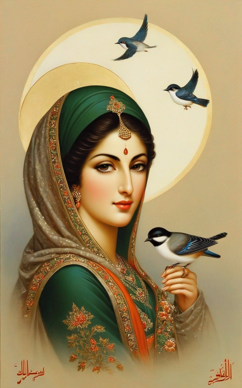 An ornate painting of a woman in a traditional green and gold dress, with a halo and a bird perched on her hand.