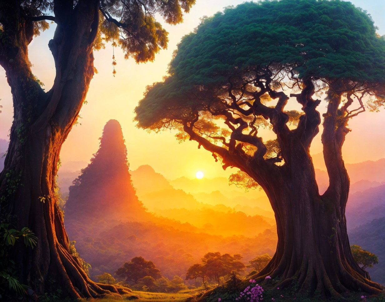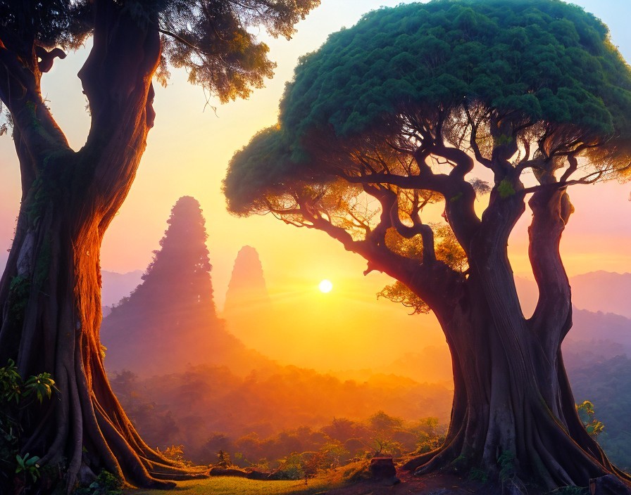3D oil, Beautiful high-definition sunrise over ancient trees at the Bà Nà Hills resort, near Da Nang, Vietnam, by Daniel Merriam with elements of the style of Alphonse Mucha, with elements of Tingatinga style and Gustav Klimt style
