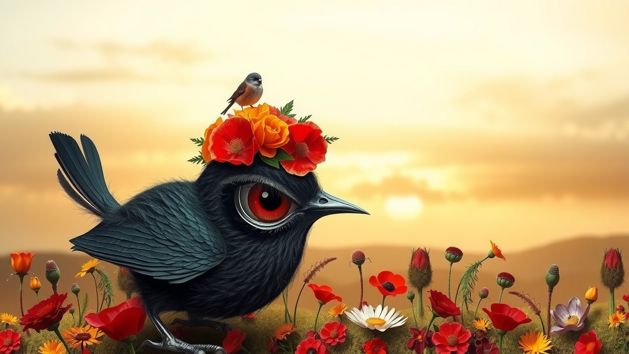 A surreal bird with a furry black body and a striking red eye descends into a dreamlike landscape. Adorned with vibrant flowers, it embodies whimsy amid a lush, enchanting backdrop.