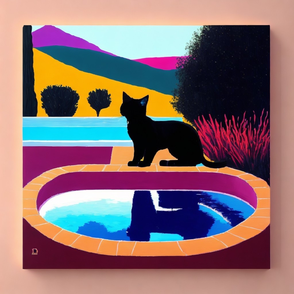 A vibrant, stylized artwork features a black cat perched beside a circular pool. The backdrop showcases colorful mountains and lush landscape, creating a striking contrast of hues.