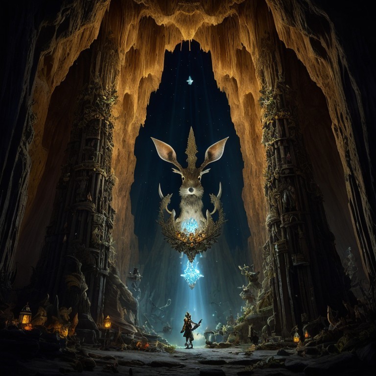 A mystical cave with a glowing skeleton of a winged creature, surrounded by lanterns and smaller figures in a ceremonial arrangement.