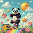 A cheerful panda in sunglasses rides a bike along a rainbow. Bright flowers, playful fish, buzzing bees, and a smiling sun create a whimsical, vibrant scene full of joy and imagination.