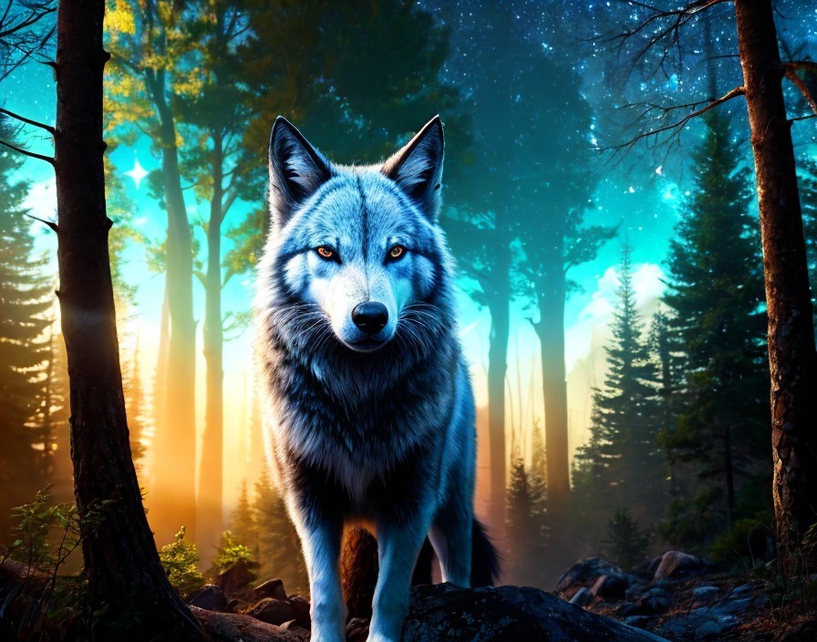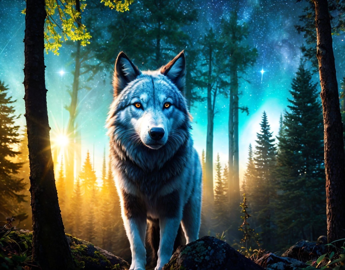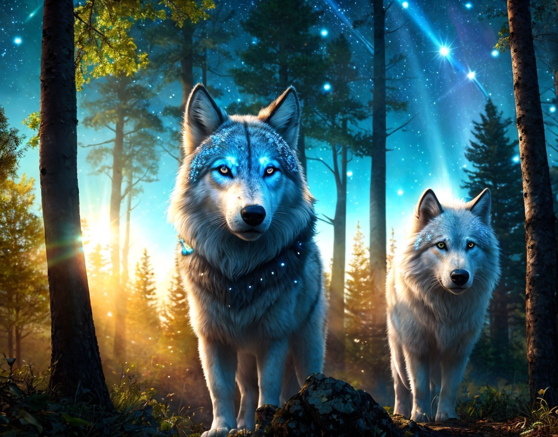 Wolves in a Mystical Forest at Sunset and Starry Sky