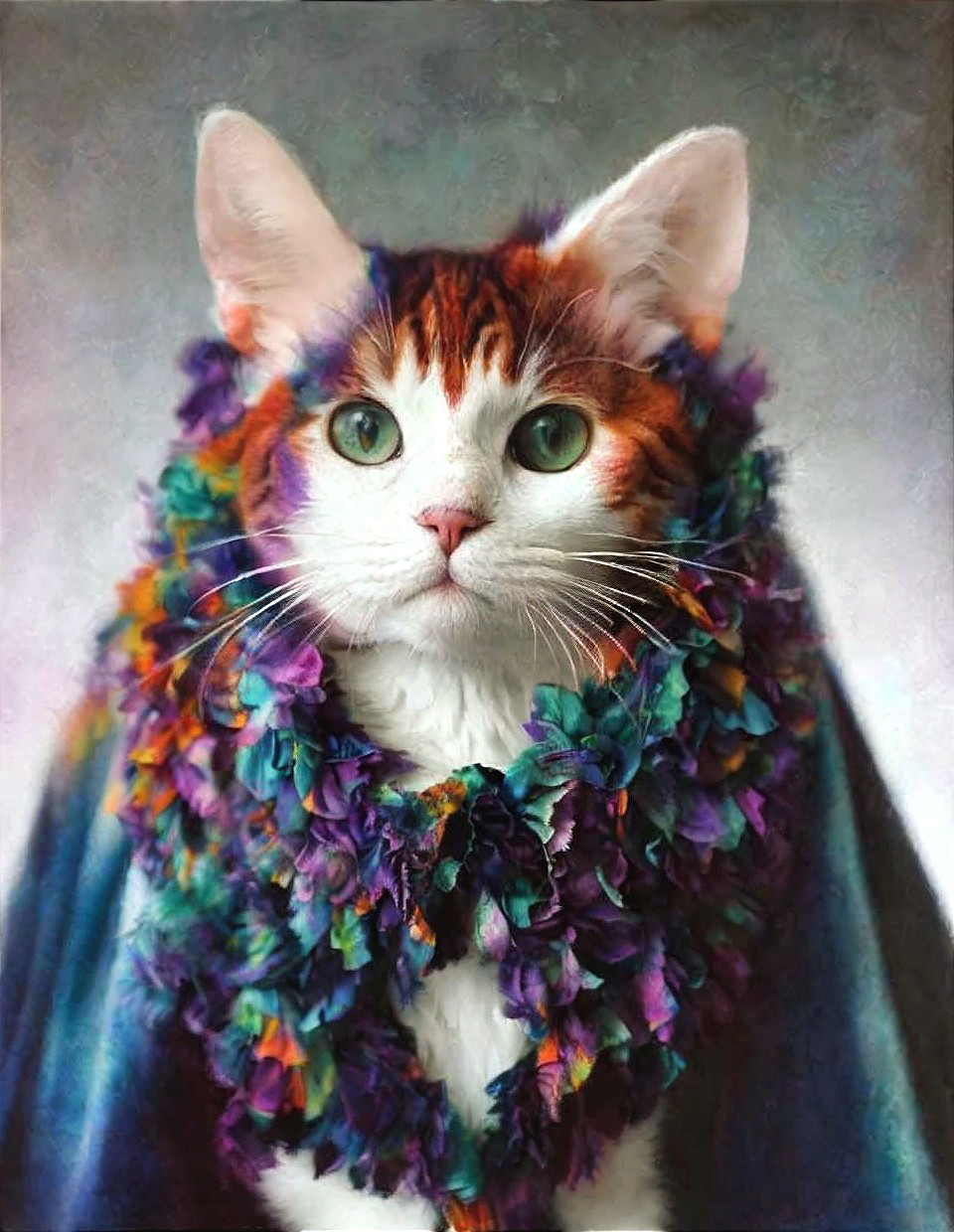 A cat with a multicolored fluffy scarf, large green eyes, and striking white and orange fur, set against a textured background.