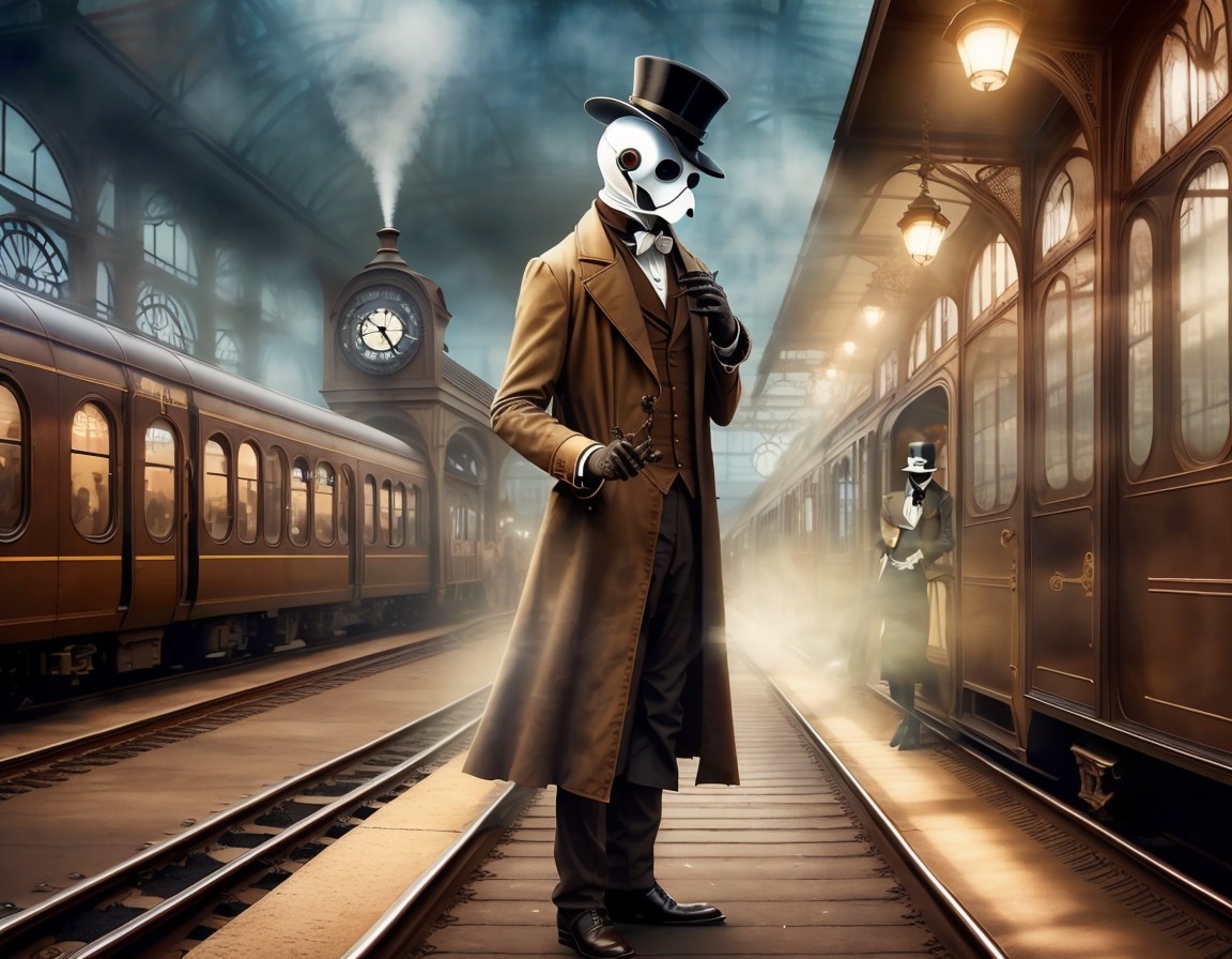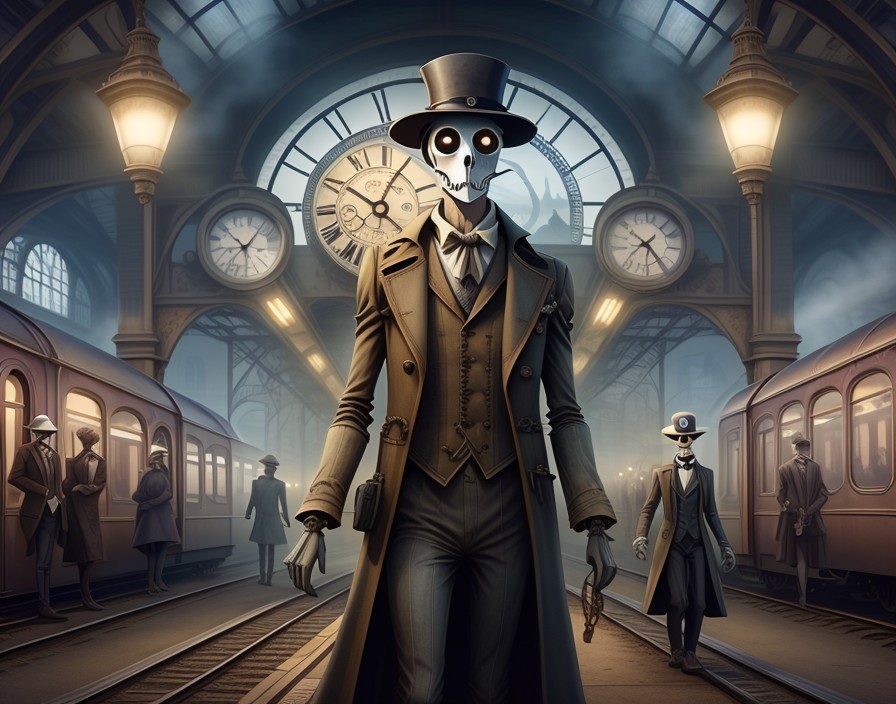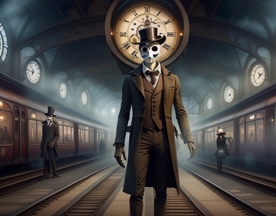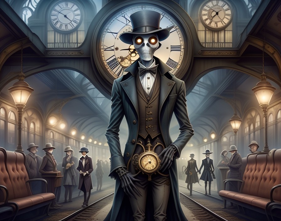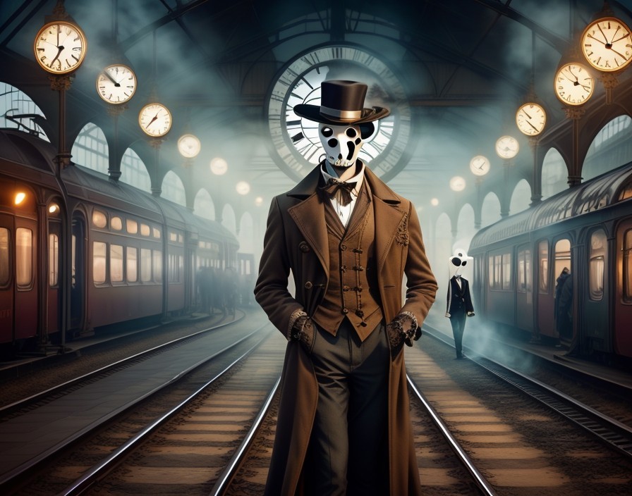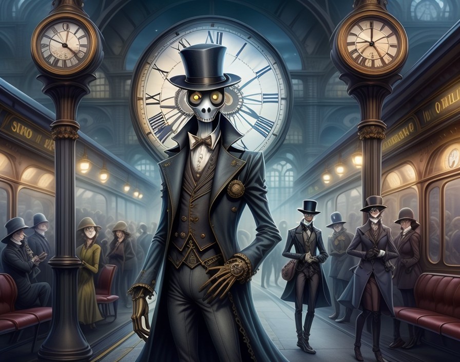 A steampunk scene with a robot in a top hat and suit in a clock-filled train station, surrounded by stylishly dressed people.