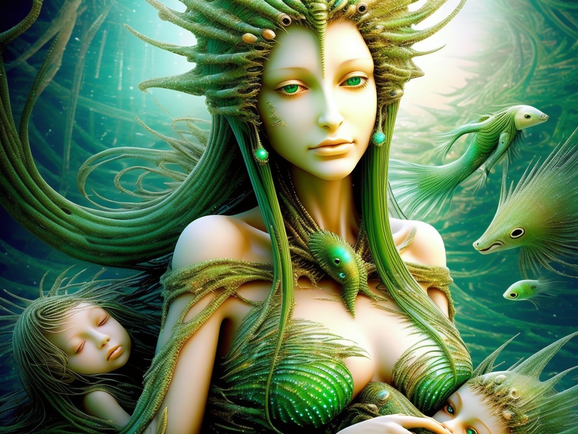 A mythical, aquatic creature with flowing green hair and shimmering scales, surrounded by fish-like beings. The serene expression conveys an enchanting underwater realm.