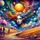 A vibrant, surreal landscape with colorful, swirling paths and whimsical trees. Three figures in flowing dresses walk toward a radiant sunset, surrounded by cosmic elements and playful hues.