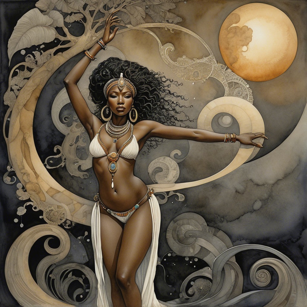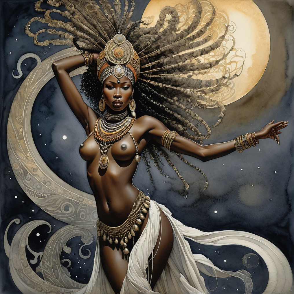A striking artwork featuring a woman with voluminous hair, adorned in intricate jewelry and a tribal outfit, dancing gracefully against a backdrop of a luminous moon and starry sky.