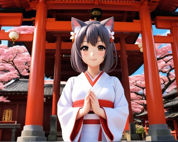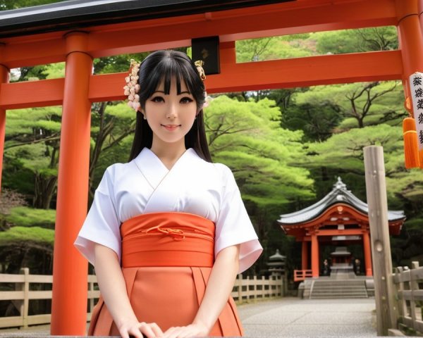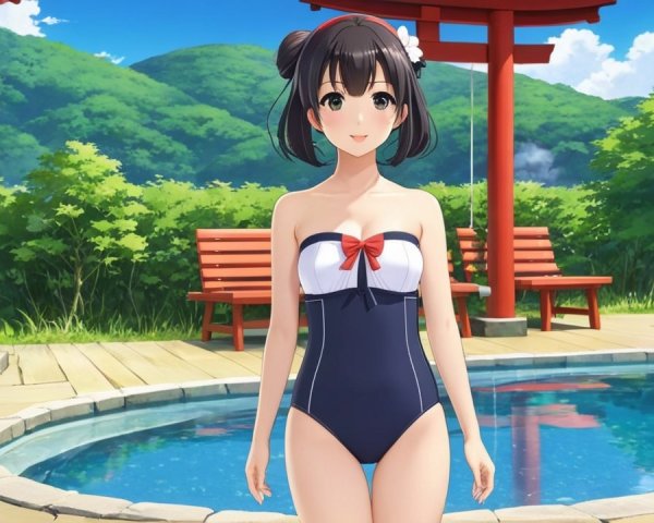 A charming anime girl dons a unique strapless swimsuit crafted from vibrant lilies, blending nature with style. Her playful expression and colorful floral design create a whimsical, enchanting vibe.