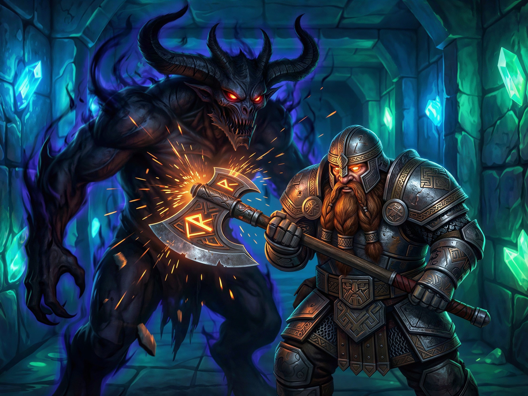 A highly detailed digital painting of an armored dwarf with a long braided ginger beard and glowing orange eyes, holding a glowing axe with orange runes, standing in a large cavern and battling a red-eyed, horned demon with black skin and purple smoke emanating from its body and claws, with bright blue and green