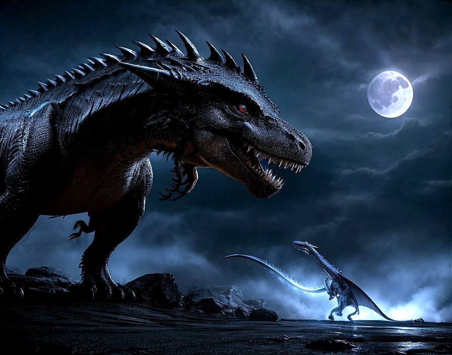 A high-definition, ultra-realistic depiction of a fierce battle between a T-Rex and a mythical dragon under moonlit rain. Detailed, dynamic lighting in a studio setting creates a cinematic, hyperrealistic 3D scene.