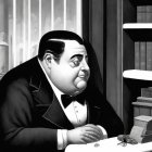 The image depicts a man in formal attire, resting his chin on his hand with a thoughtful expression. He sits beside an open book, surrounded by bookshelves, with a glass of drink nearby.