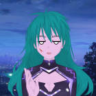 A striking character with vivid green hair and haunting eyes stands against a twilight backdrop. Her eerie appearance features dark markings, evoking a gothic, supernatural vibe.