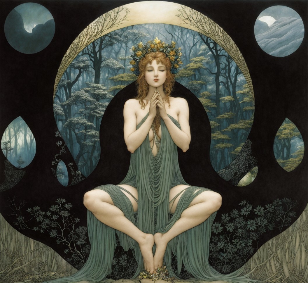 A mysterious woman sits gracefully within a circular frame, surrounded by serene forest motifs. Her flowing attire and poised demeanor evoke a sense of ethereal beauty and nature's harmony.