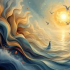 A child with golden wings rides a bicycle through fluffy clouds, illuminated by a radiant sun. Their joyful expression showcases a sense of adventure amid green leaves swirling around z.'s Icarus and JF's T~bike from the hedgehog..