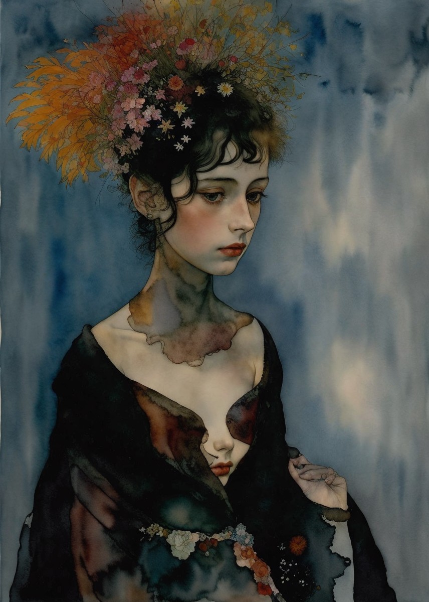 A painting of a woman with striking features, an ornate headpiece, wearing a dark dress, beside a lit candle, set against a moody blue backdrop.