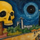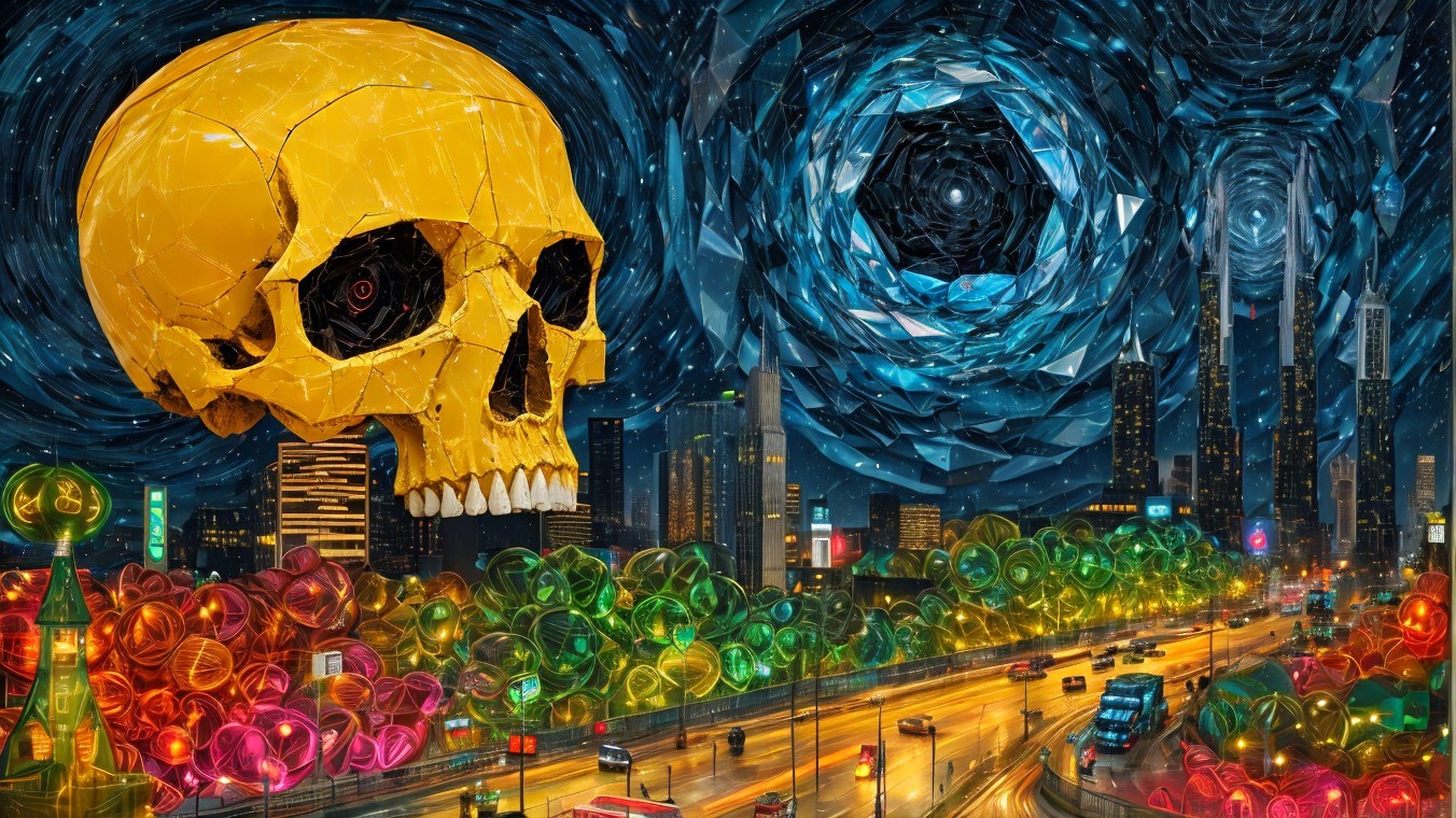 A vibrant cityscape at night features a large, golden skull floating above, surrounded by swirling galaxies. Colorful trees line the streets, reflecting a surreal blend of urban life and cosmic imagery.