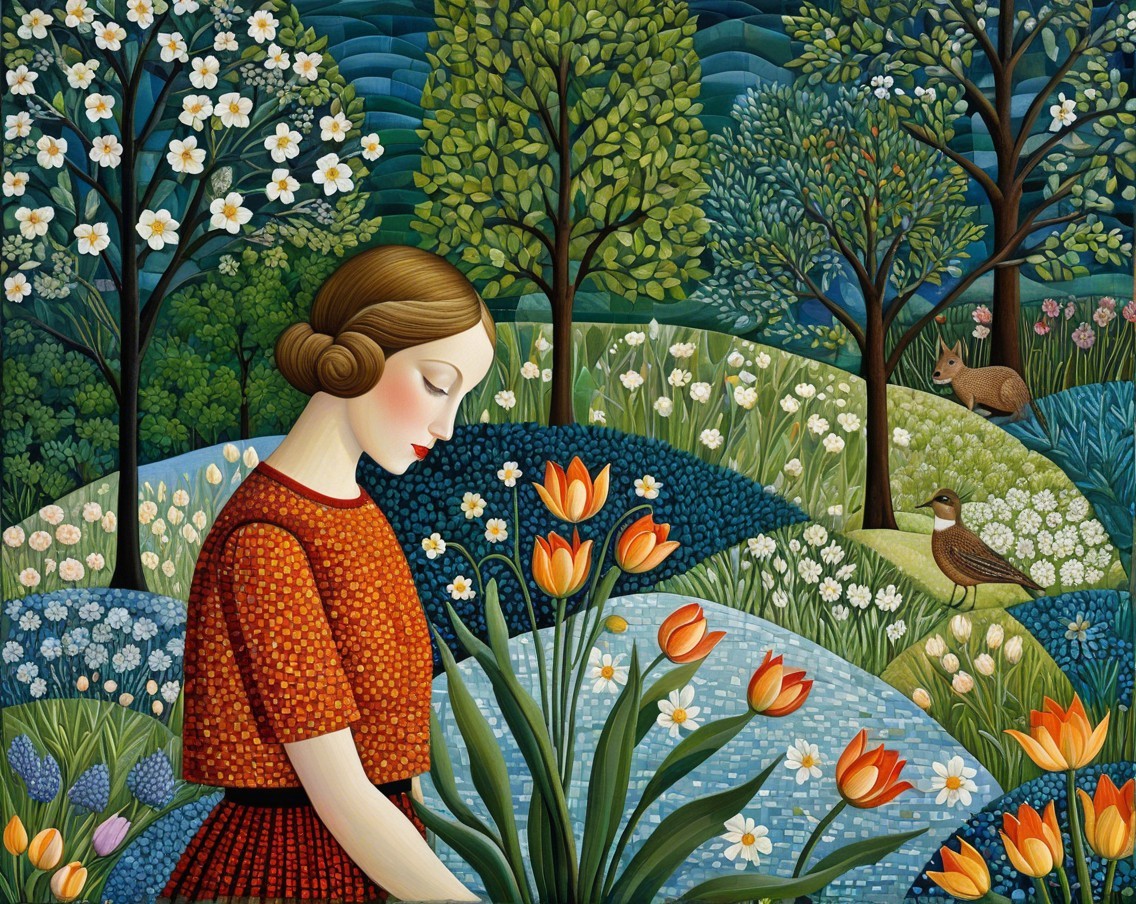 A serene landscape features a young woman with a gentle expression, surrounded by vibrant tulips, lush trees, and blooming flowers, with birds and a tranquil pond enhancing the peaceful scene.